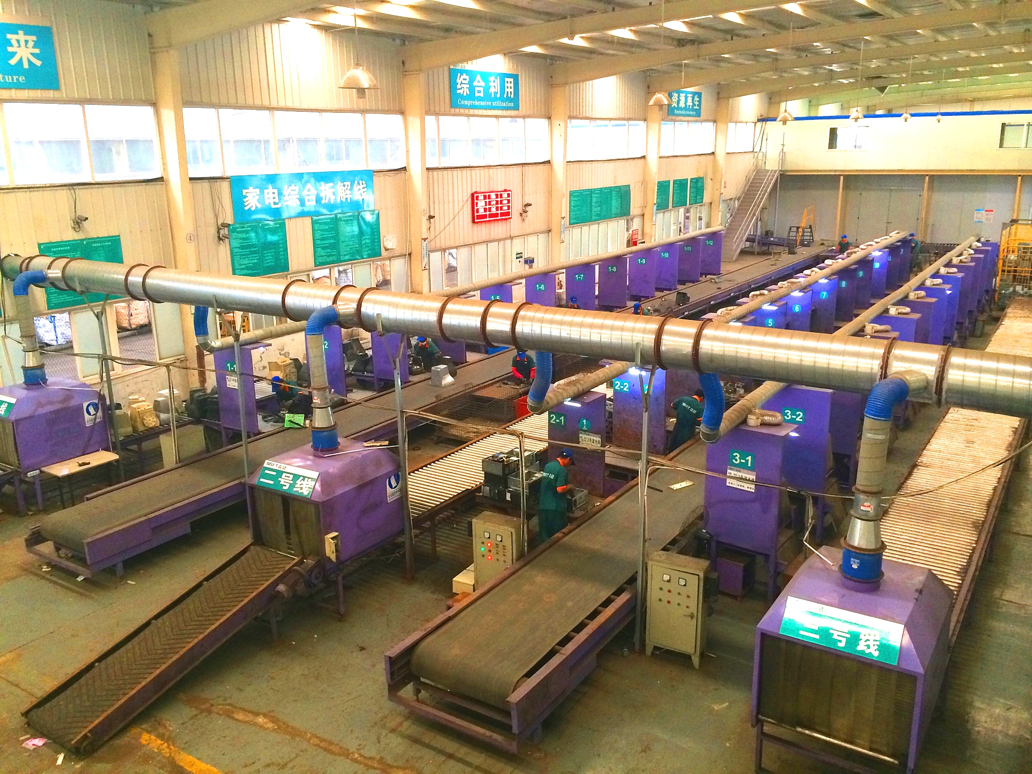 森蓝年综合处置废旧电视机、冰箱、空调、洗衣机、电脑等四机一脑48万台及办公电器12万台,拥有包括废旧电视、电脑、空调、洗衣机等大型家用废旧电器从整机自动上料,到单机重量、型号等ERP信息数据采集,到零部件精拆,关键污染部件的分离,再到产物细分的精细化拆解流水线4条;拥有电子元器件回收及线路板基板深加工处理线1条;废旧冰箱整机破碎与氟利昂回收一体化生产线1条;由PLC自动控制的电线电缆综合处理线1条;CRT锥屏切割与荧光粉回收线3条;配套4条年循环利用2万吨电子废弃物包装塑料的生产线。